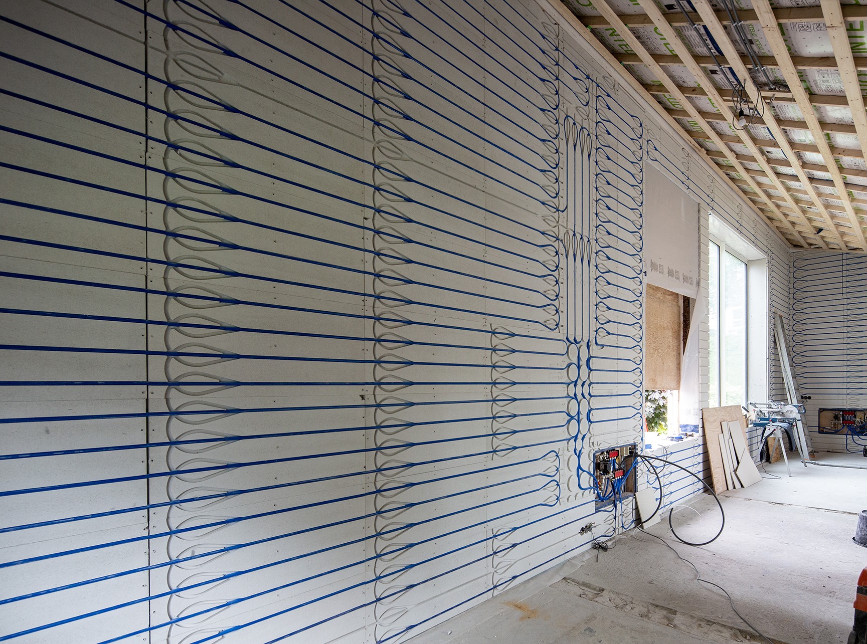 Takket være den elastiske binding af fermacell™ Niveaumørtel T kunne alle krav opfyldes uden kompromiser: øget lydisolering i loftkonstruktionen lavet af træbjælker med OSB-plader lagt ovenpå.